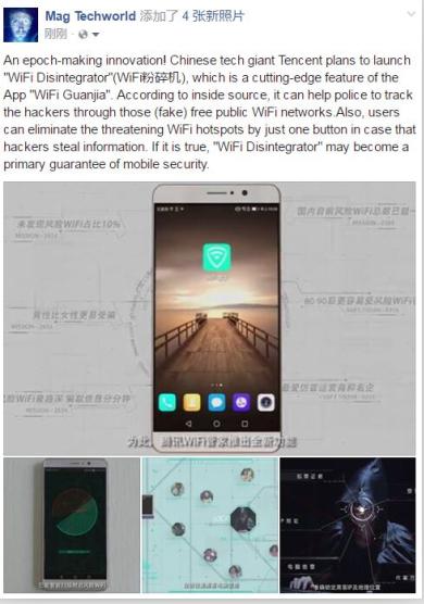 作为互联网巨头BAT之一的腾讯,就算突然发布什么神奇的产品,也不会让人太惊讶,连外媒也时刻关注着这个网络巨人。就在愚人节前夕,Facebook和推特上出现了一则小道消息,表示腾讯准备推出“风险WiFi粉碎机”。